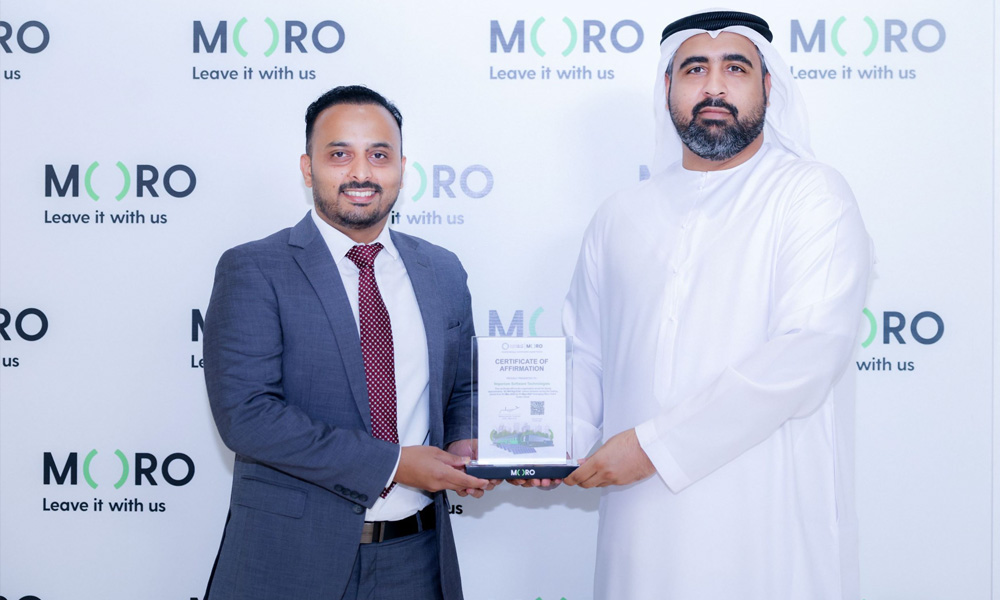 Moro Hub has presented a Green Certificate to Imperium Software Technologies in recognition of the latter’s adoption of sustainable technology solutions hosted on Moro Hub’s Green Cloud. The award was presented by Sultan Al Ali, Director of Digital Business at Moro Hub, to Sanju Sambasivan, Director of Sales at Imperium Software Technologies.